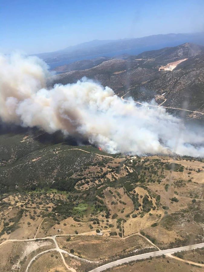 Συνεχίζει να καίει ανεξέλεγκτα η πυρκαγιά στους Ραπταίους του Δήμου Καρύστου. Η φωτιά καίει δασική έκταση και κινείται απειλητικά προς τον οικισμό Δήλησο.