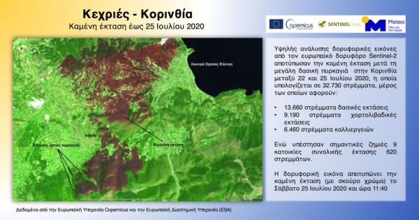 Σε σχετικό γράφημα παρουσιάζονται δεδομένα από την Ευρωπαϊκή Υπηρεσία Copernicus, η οποία ενεργοποίησε την Υπηρεσία Εκτάκτων Αναγκών και Χαρτογράφησης έπειτα από αίτημα της Ελλάδας στην Ευρωπαϊκή Ένωση, και παρέχει δωρεάν δεδομένα στις αρμόδιες υπηρεσίες της χώρας μας.