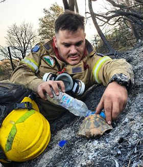 Ο πυροσβέστης A.M δίνει νερό σε μια χελωνίτσα κοντά στην περιοχή της Πάτρας που ξέσπασε η πυρκαγιά.