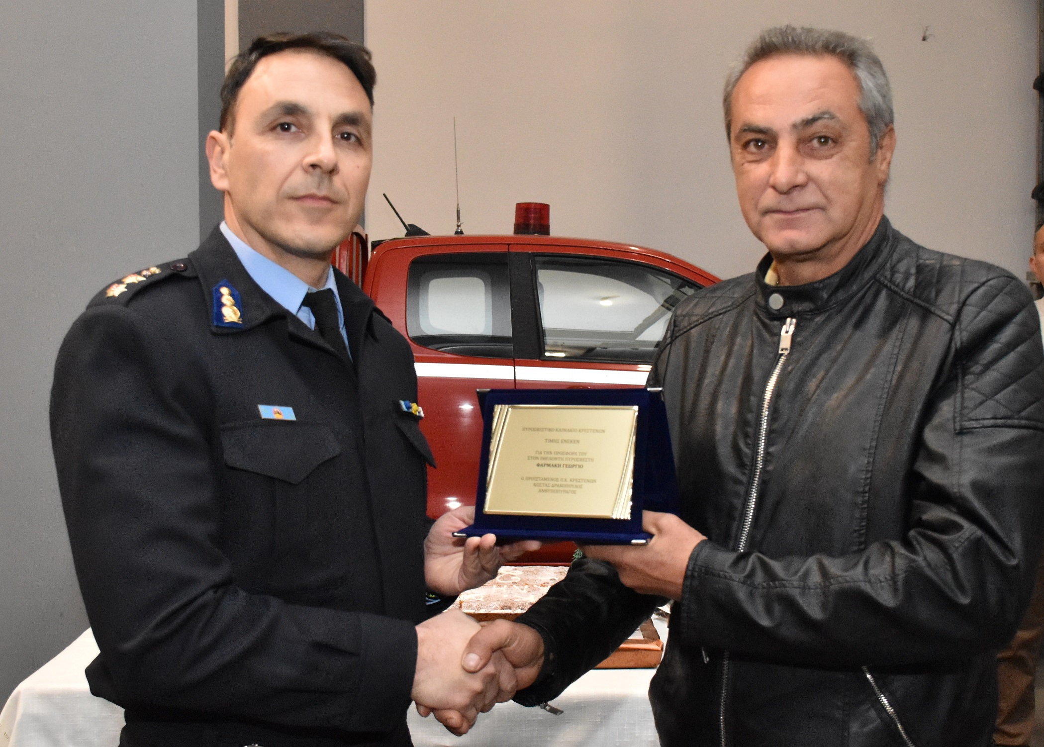 Η απονομή έλαβε χώρα στο κτήριο του Π/Κ παρουσία του υποδιοικητή της Π.Υ Πύργου Αντιπύραρχου Νίκου Σμαρνάκη, του Προιστάμενου Π/Κ Κρεστένων Ανθυποπυραγού Κωνσταντίνου Δρακόπουλου καθώς και αξιωματικών του κλιμακίου.