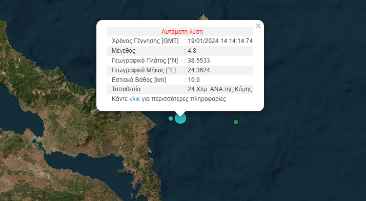 Συγκεκριμένα το επίκεντρο εντοπίζεται στα 24 χιλιόμετρα ανατολικά της Κύμης, με εστιακός βάθος τα 10 χιλιόμετρα.