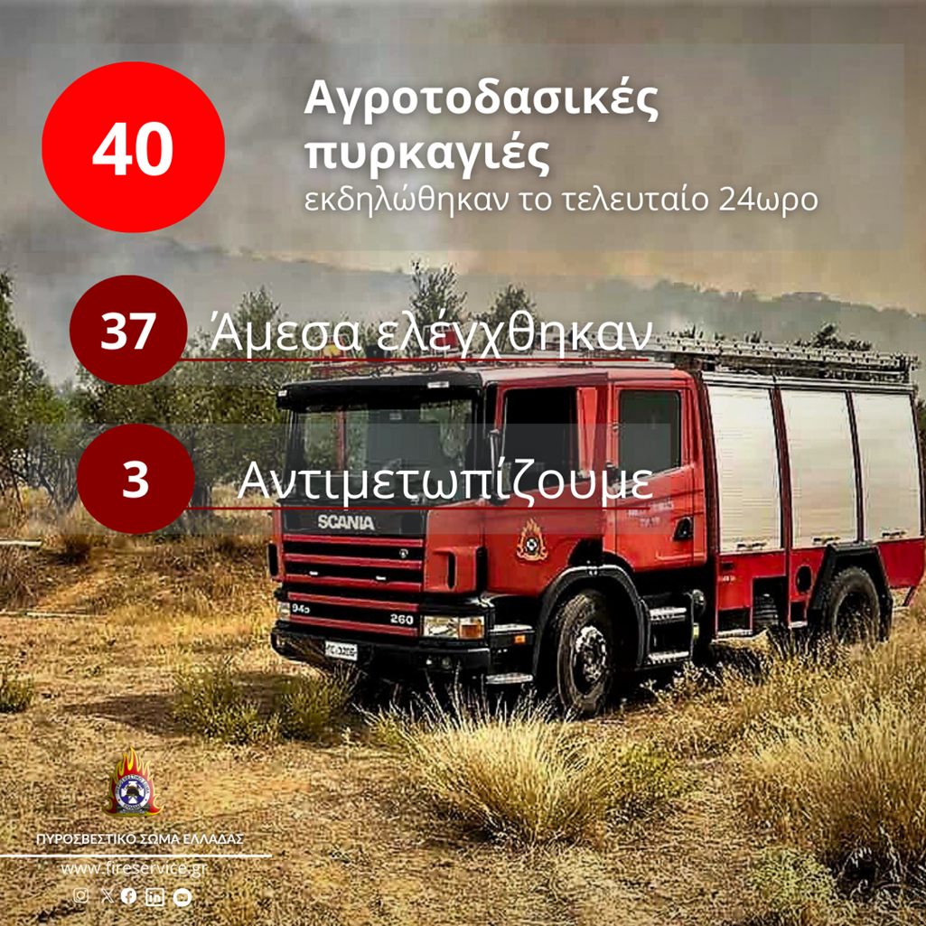 Από Ω/18:00/01-10-2024 έως Ω/18:00/02-10-2024 εκδηλώθηκαν 40 αγροτοδασικές πυρκαγιές, από τις οποίες οι 37 αντιμετωπίστηκαν άμεσα, στο αρχικό τους στάδιο, ενώ οι πυροσβεστικές δυνάμεις αντιμετωπίζουν ακόμη τρεις (3).